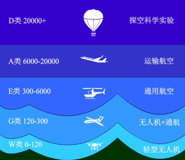 第十一条 【空域分级分类制度】国家建立空域分级分类管理制度。第十二条 【空域等级】综合考虑飞行规则、空域环境、航空器性能、空中交通服务等因素,空域分为管制空域(A、 B、C、D、E类)和非管制空域(G、W类)。A类空域通常为标准气压高度6000米(含)以上至标准气压高度20000米(含)的空间。G类空域通常为B、C类空域以外真高300米以下空域(W类空域除外),以及平均海平面高度低于6000米、对军事飞行和民航公共运输飞行无影响的空域。W类空域通常为G类空域内真高120米以下部分空域。D类或者E类空域是除A、B、C、G、W类空域外的空间,可以根据运行和安全需求选择划设。其中,标准气压高度20000米以上统一划设为D类空域。空域分类具体方法和准入条件由国家空中交通管理领导机构的办事机构制定发布。第十三条 【空域范围确定及公布】B、C、D、E、G类空域范围由地区空中交通管理组织协调机构提出建议方案,报国家空中交通管理领导机构或其授权的机构批准。第十四条 【空域类型】综合考虑空域限制类型、使用用途等因素,空域分为空中禁区、空中限制区、空中危险区、空中保留区、航路航线、进出境点、等待空域、空中放油区、试飞空域、训练空域、防空识别区、临时空域等。第十五条 【空域等级、类型转换】在确保空域安全和秩序的前提下,为提高空域使用效能,部分空域的等级、类型以及相应管理机构可以相互转换。实行空域等级、类型转换的名录、实施步骤、具体范围和有关要求,由国家空中交通管理领导机构的办事机构制定公布。