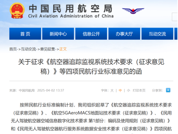 4月2日,民航局适航司发布了《民用无人驾驶航空器空域信息数字化技术要求 第1部分:编码及使用规则(征求意见稿)》和《民用无人驾驶航空器航行服务系统数据安全技术要求(征求意见稿)》。意见征集日期截至2025年5月6日。据介绍,其中的 《民用无人驾驶航空器空域信息数字化技术要求 第1部分:编码及使用规则》这一标准的发布和实施,将有助于 CCAR-92 部规章“E 章空中交通管理 第二节 空域管理”贯彻落实,有力推进无人机空管体系建设和无人机产业发展。而另一标准《民用无人驾驶航空器航行服务系统数据安全技术要求》的发布和实施,将有助于 CCAR-92 部规章“E 章空中交通管理 第三节 空中交通服务”贯彻落实,有力推进无人机空管体系建设和无人机产业发展。